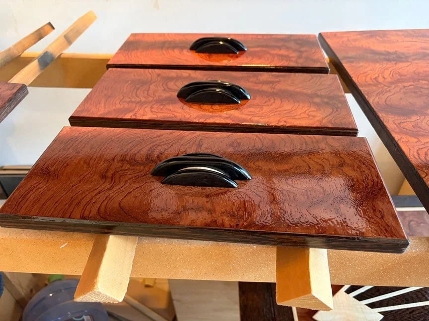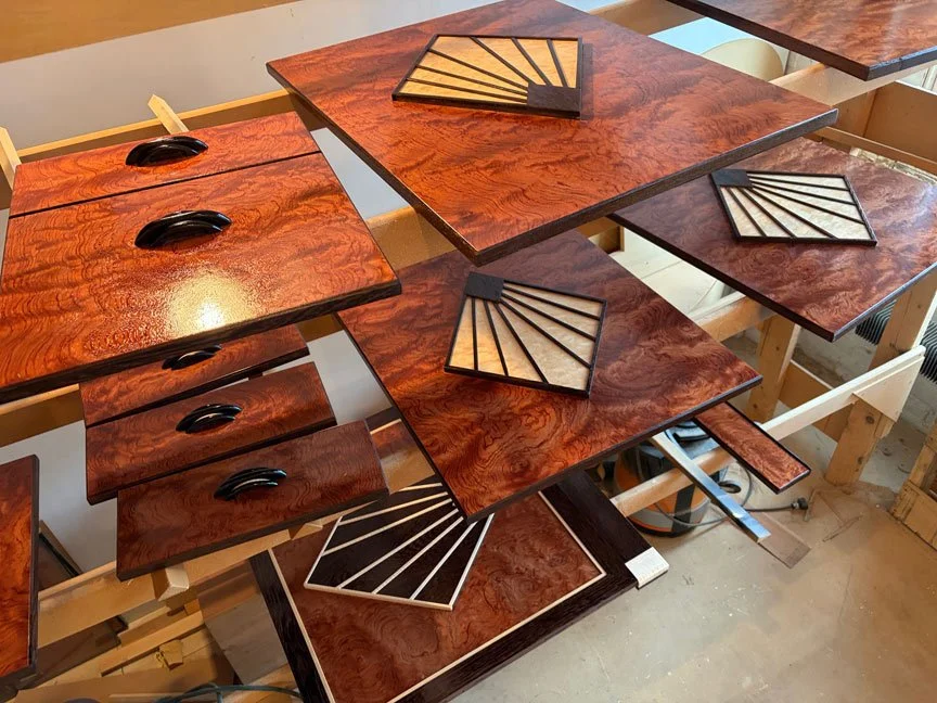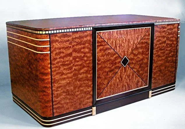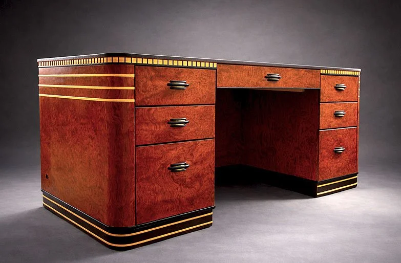 Custom Art Deco desk handcrafted in richly figured bubinga wood with bold geometric detailing and classic Deco lines. This executive desk features generous drawer storage, rounded corners, and a strong architectural presence—perfect for a sophisticated home office.