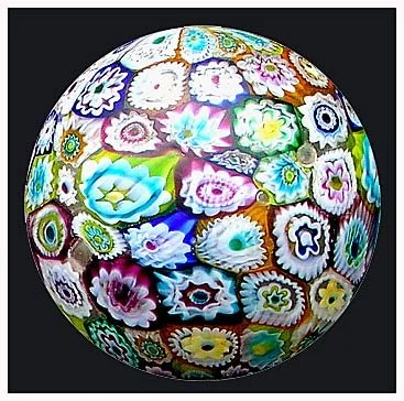 Millefiori: A decorative glasswork technique with roots in antiquity, Millefiori—Italian for “a thousand flowers”—was perfected by Murano glassmakers in the 19th century. The process involves fusing rods of colored glass, stretching and slicing them into cross-sections, and embedding the intricate slices into objects like vases, beads, and globes.