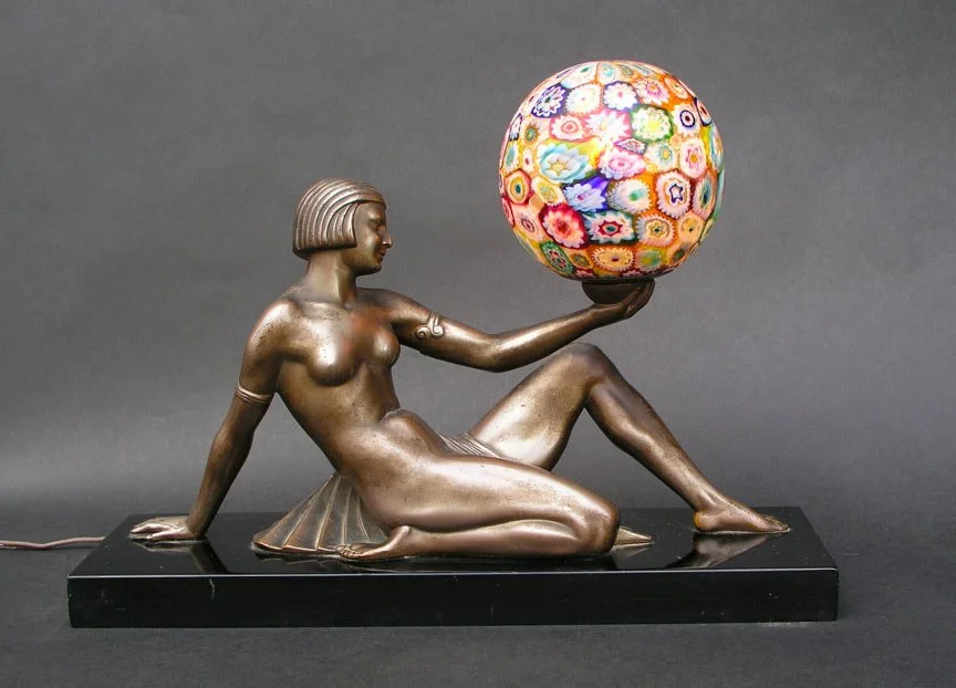 This lamp was made in 1907 by the J.B. Hirsch Company in New York City. She is a bronze-plated lady holding a delicate Millefiori globe—a striking example of early 20th-century craftsmanship.