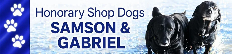 Blue, an eight-week-old Golden Retriever, left his littermates to step into the world of fun and games as our next Shop Dog. Ginger had to adjust to this rambunctious pup, especially his habit of tail-pulling. She made sure to set him straight, and eventually, they found their rhythm. Ginger lived to 13, and Blue passed at 15